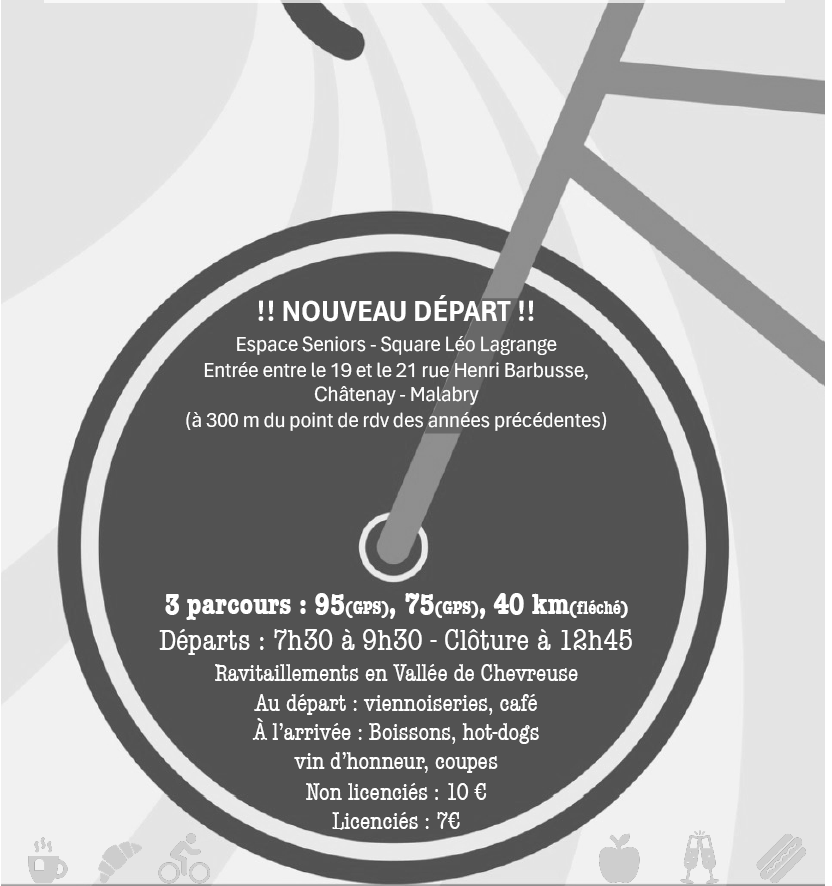 Espace Senior entre le 19 et le 21 rue Henri Barbusse, Chatenay-MalabryNOUVEAU DÉPART : Départ entre 7h30 et 9h30 à l'Espace Séniors, entrée entre le 19 et le 21 rue Henri Barbusse → lien Google Maps 🗺️ Trois parcours dans la vallée de Chevreuse sont proposés. Venez profiter de l'ambiance du club : café ☕ croissant🥐 au départ 1 ou 2 ravitaillements 🍷 selon la distance hot-dogs 🌭 et ambiance...